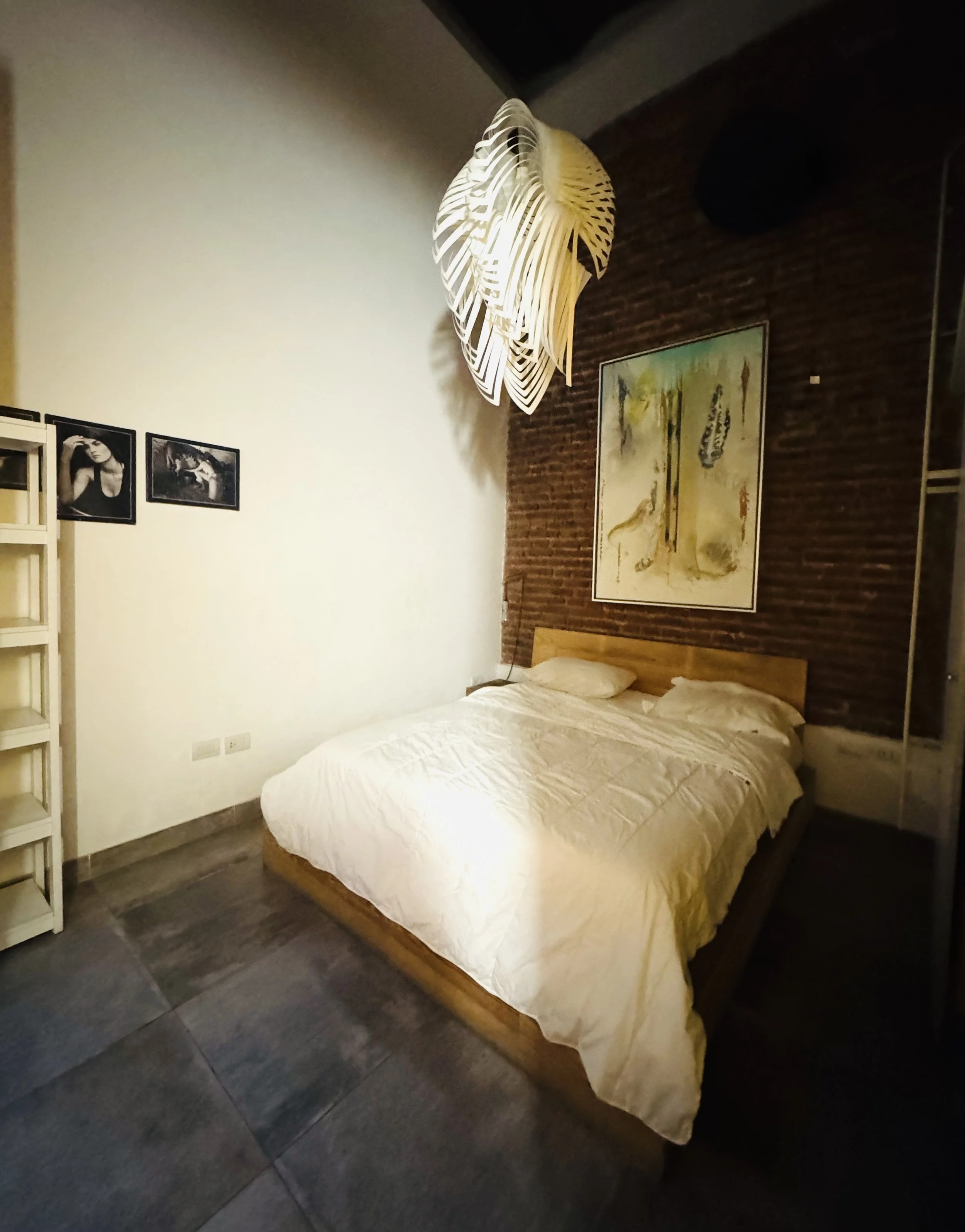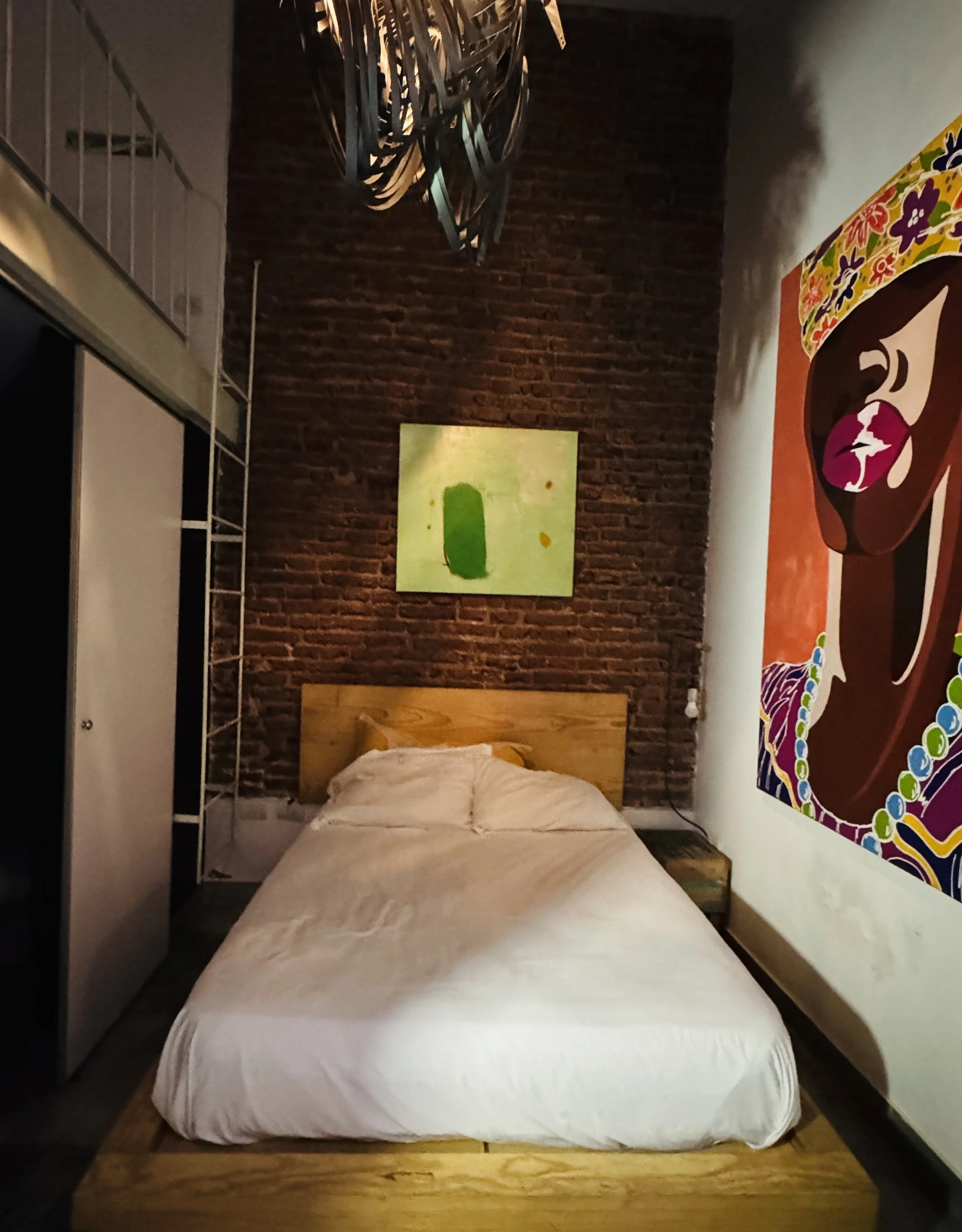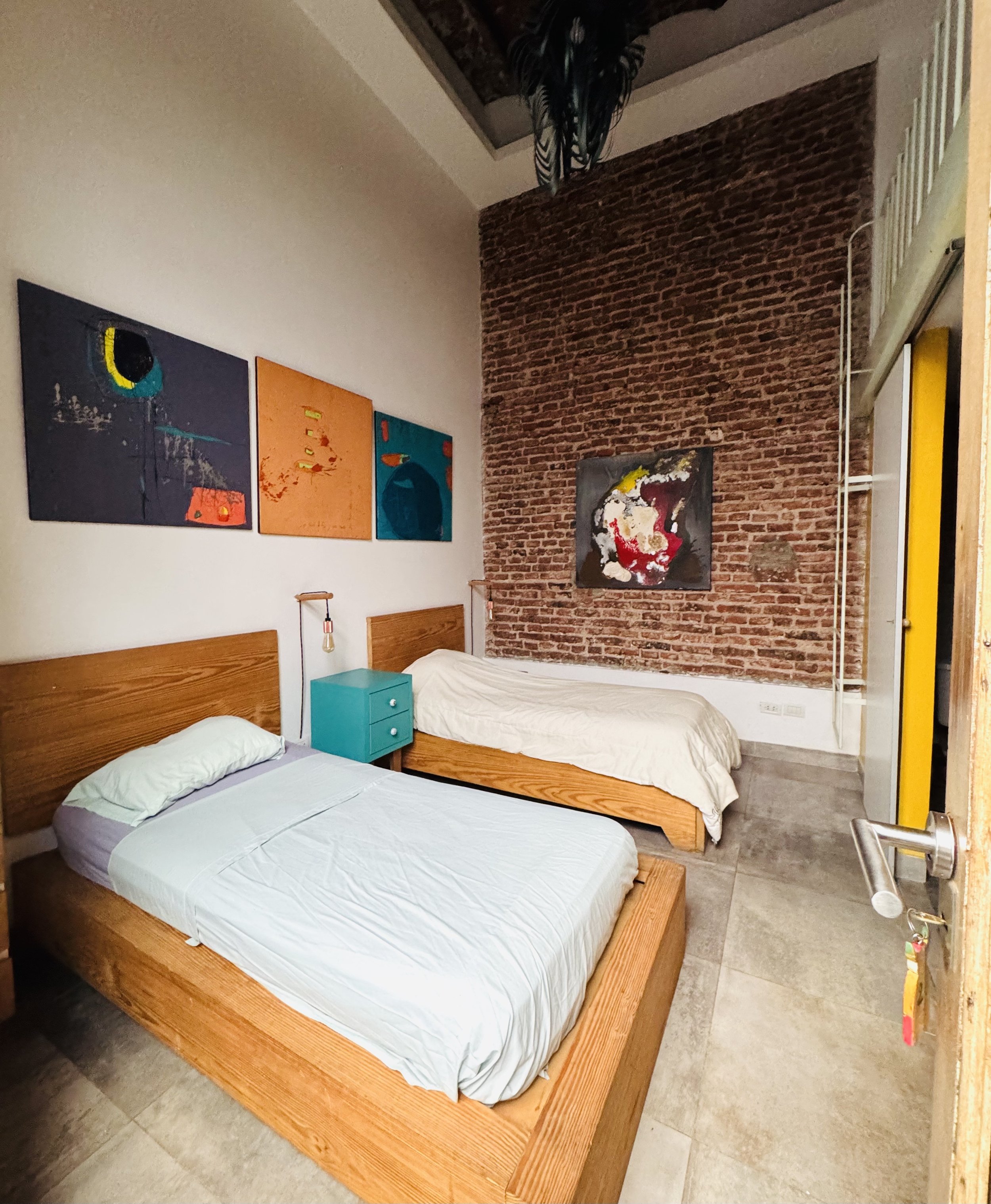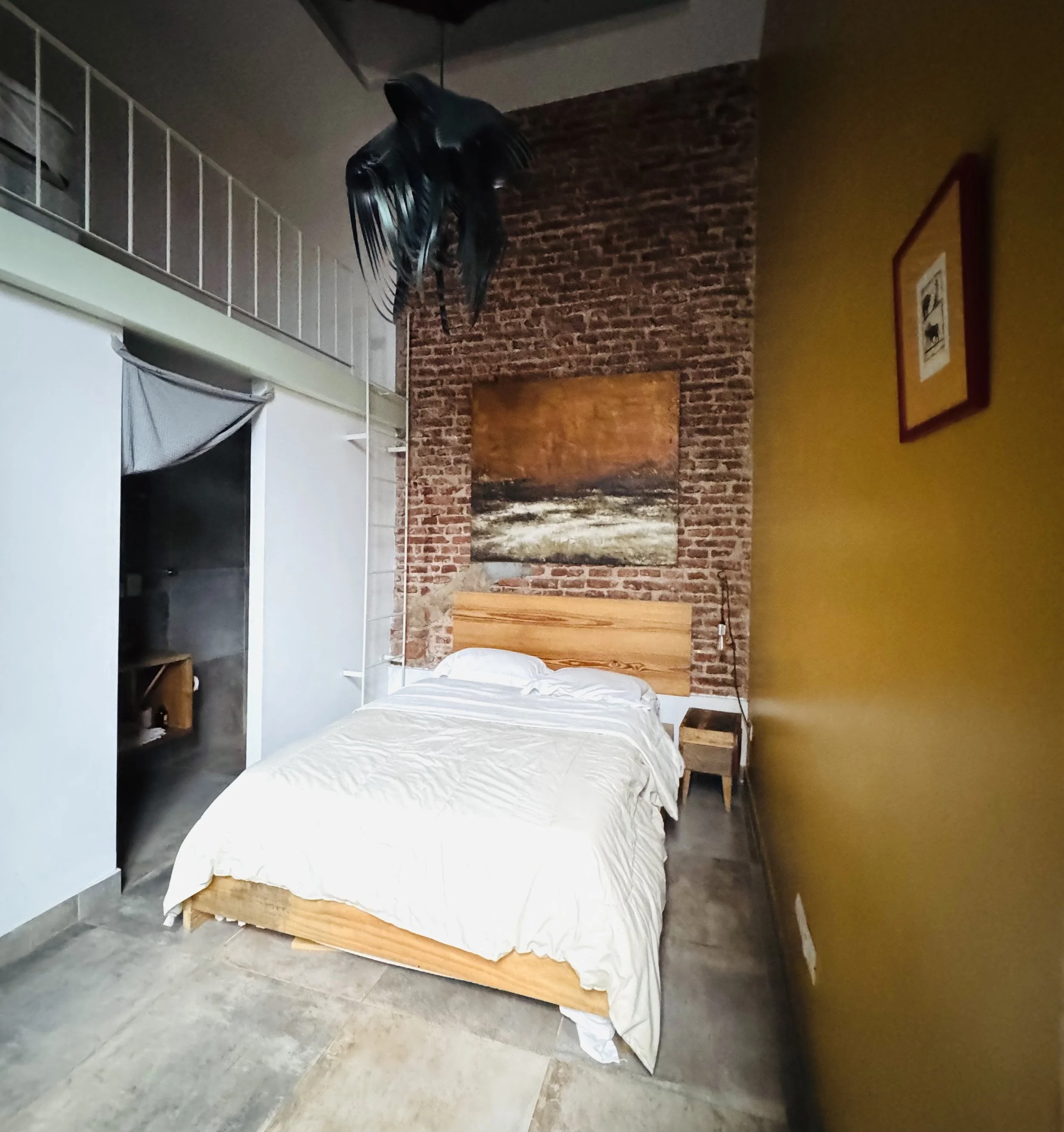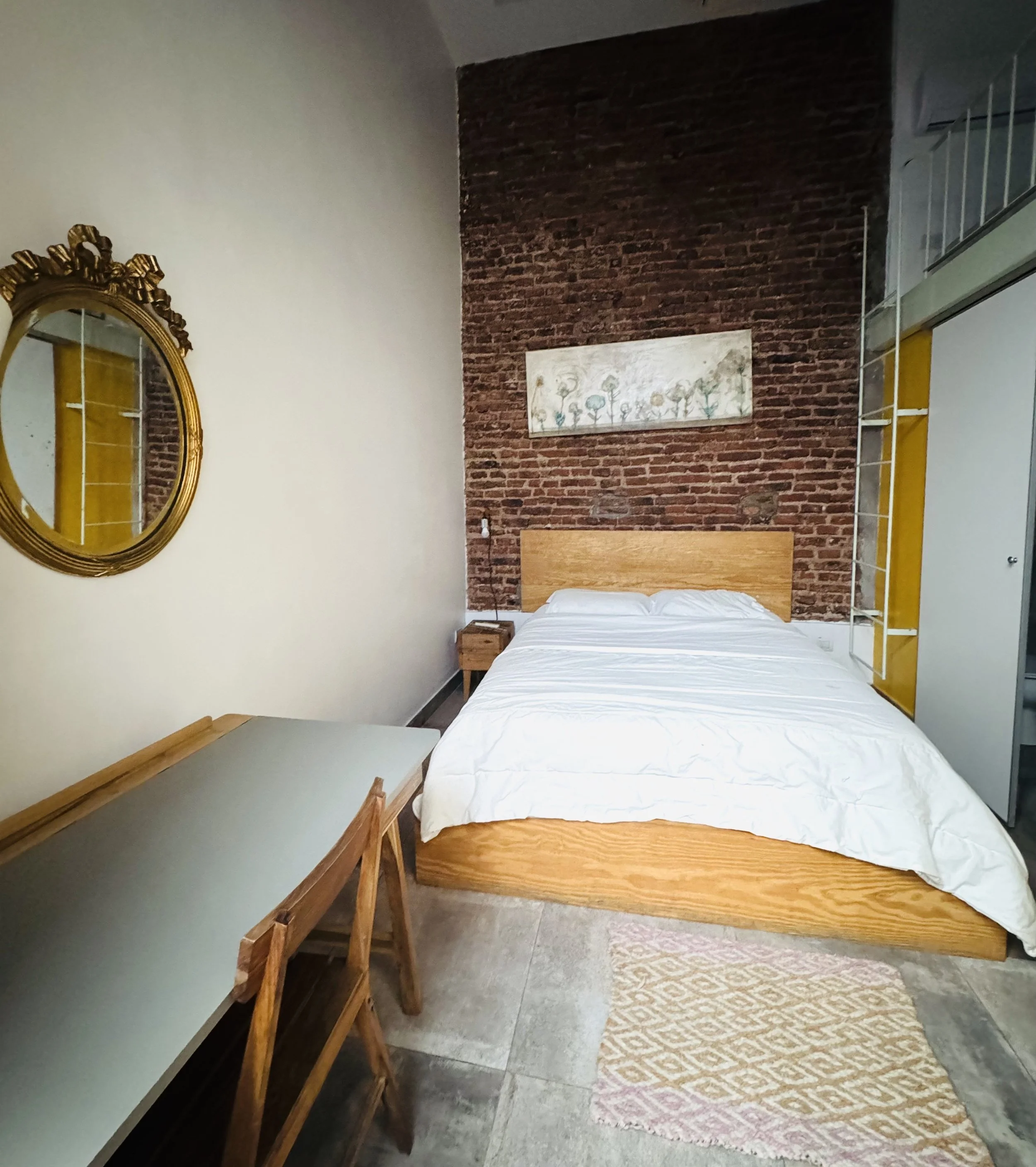 Located on the first floor, the Broodthaers Room offers a refined and comfortable space designed for a restful stay. The room features a 1.6 m wide double bed and a single bed on the mezzanine level, providing a flexible arrangement suitable for couples, friends, or small families.